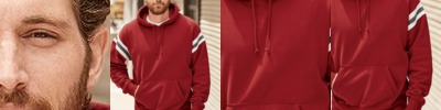 4.9 oz. 65/35 cotton/polyester; Solid jersey body; Raglan sleeves; Pouch pockets; Hem cuffs and bottom; Drawstring hood;