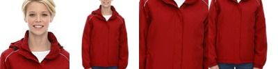 storm flap with snap closure at bottom; brushed tricot-lined collar and chin guard; centre front autolock zipper with reflective toggle; roll-away hood; elasticized cuffs; lower brushed tricot-lined concealed zippered pockets ; thermal retention shockcord at hood and drop back hem; audio port access through inside left pocket; reflective piping at shoulder yoke and back side panels;